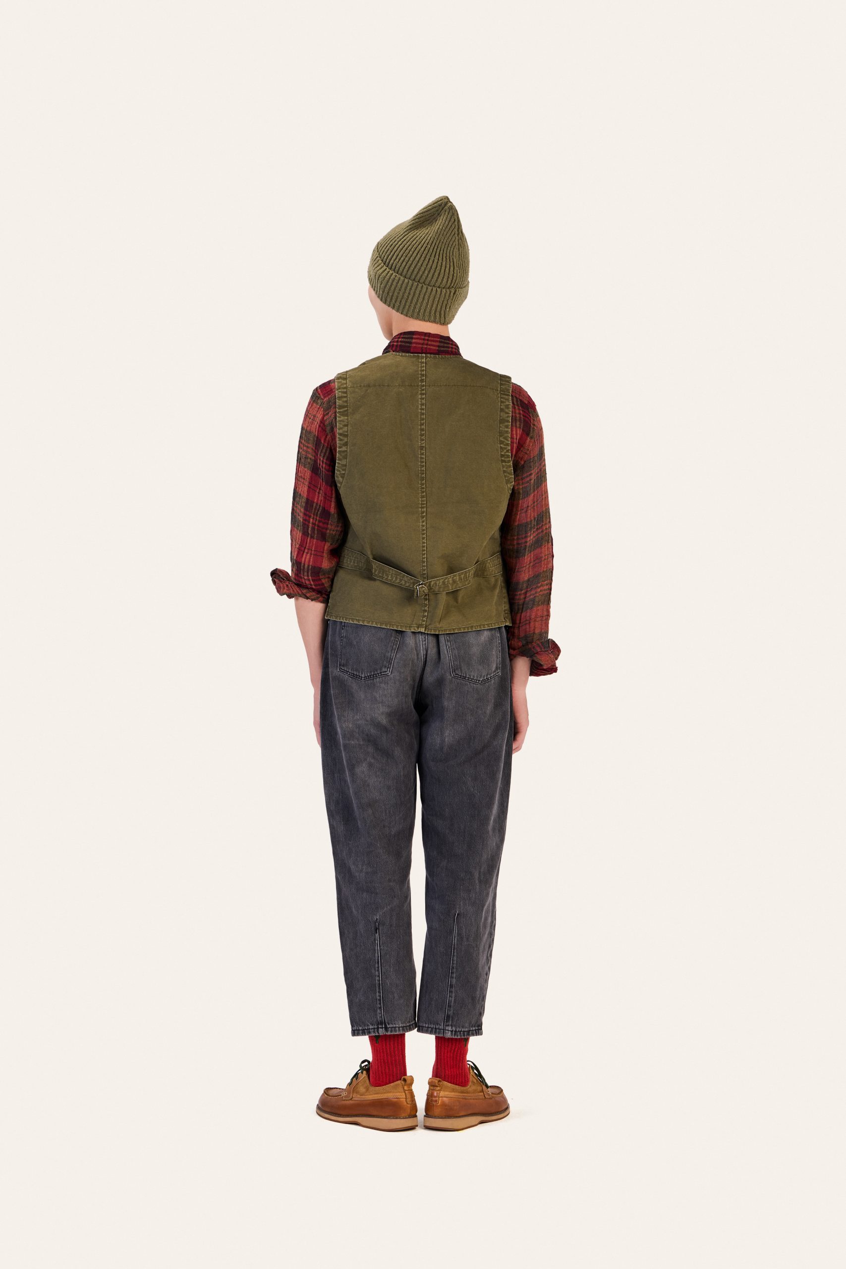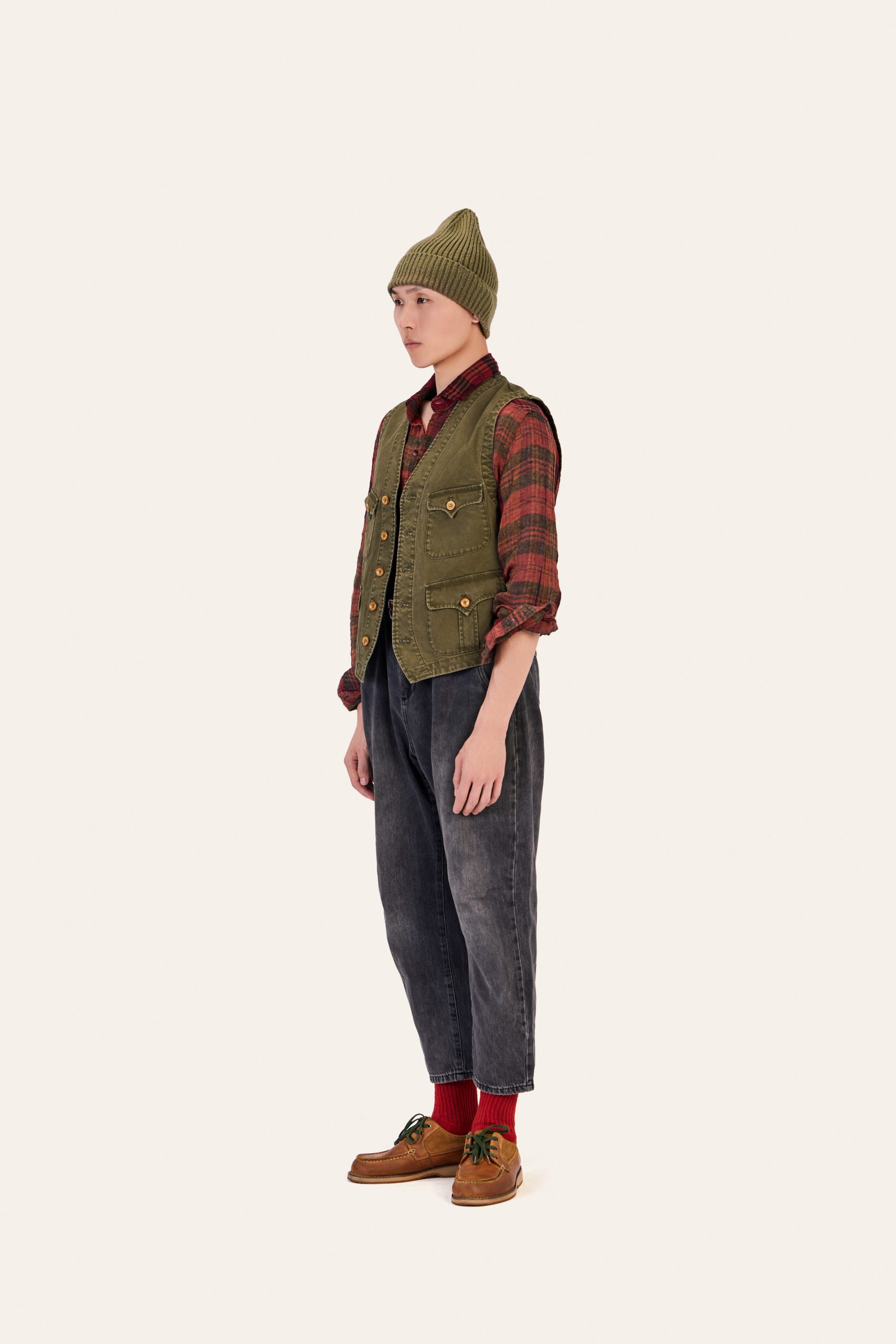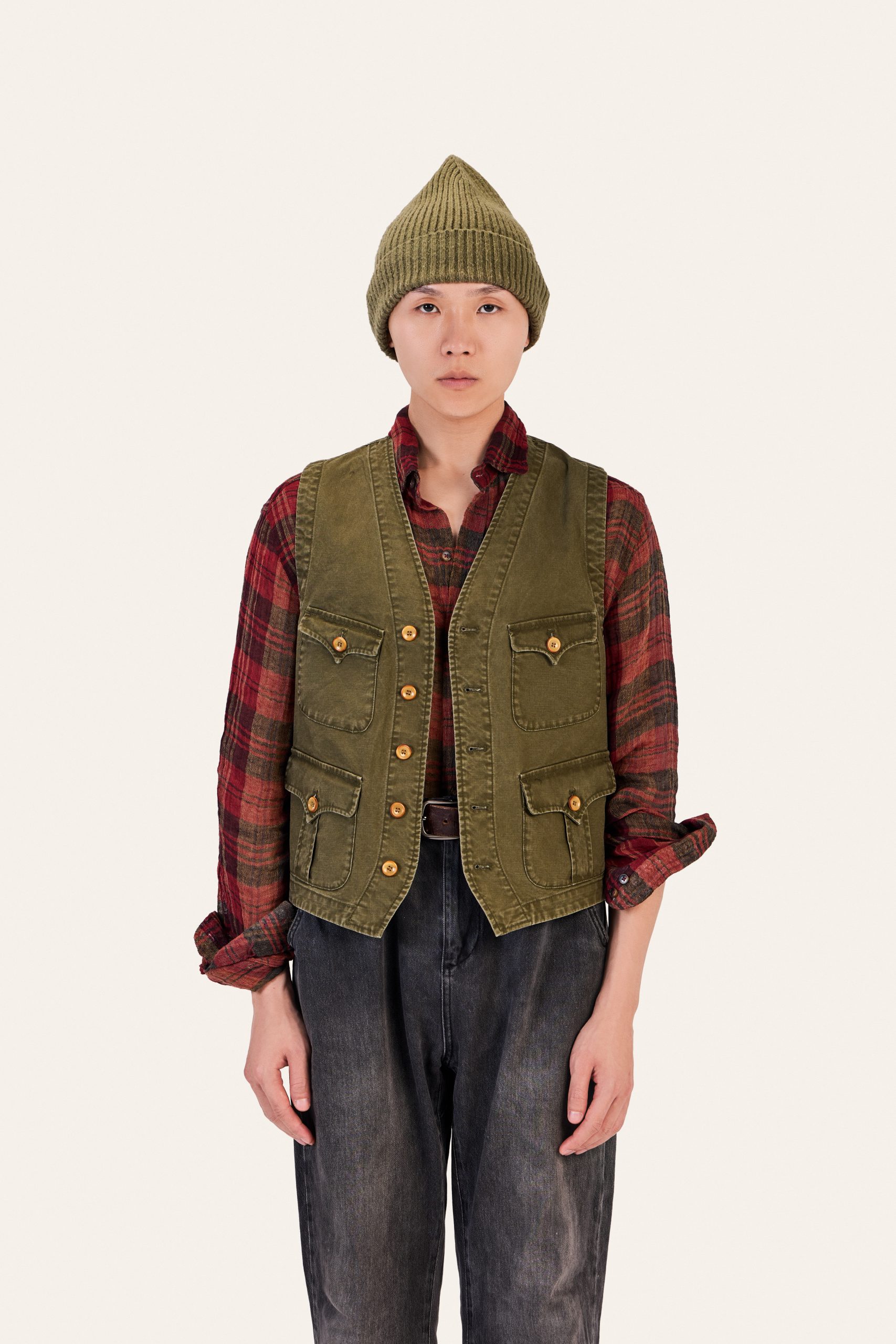 Crafted from durable yet lightweight gabardine, this vest is a refined take on classic workwear. Designed for both functionality and effortless style, it features a tailored fit, multiple flap pockets with button closures, and a deep V-neck for versatile layering. The structured fabric offers a smooth drape, while the raw-edged details add a touch of vintage character. Whether paired with a simple tee for a laid-back look or layered under outerwear for added depth, this piece is a timeless essential.