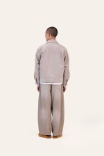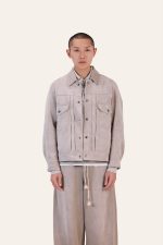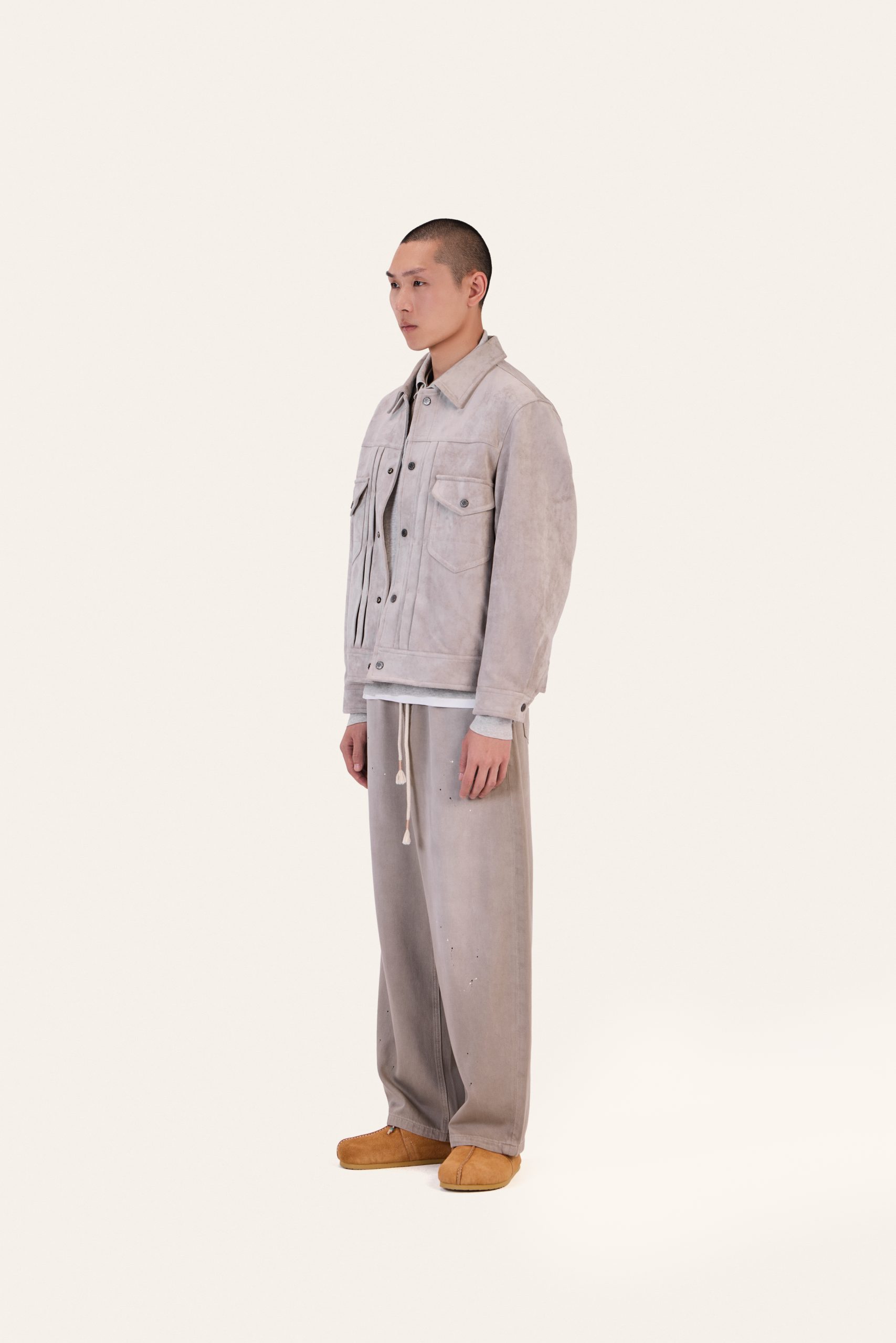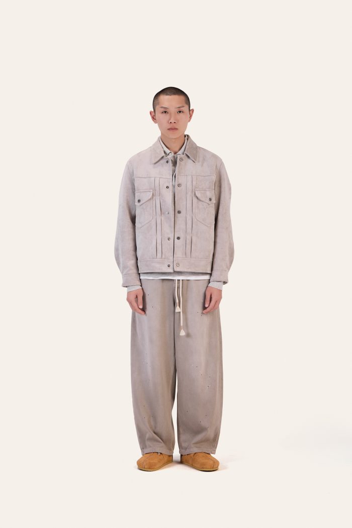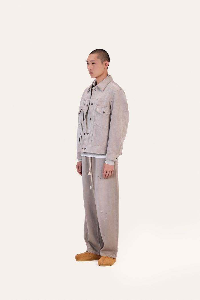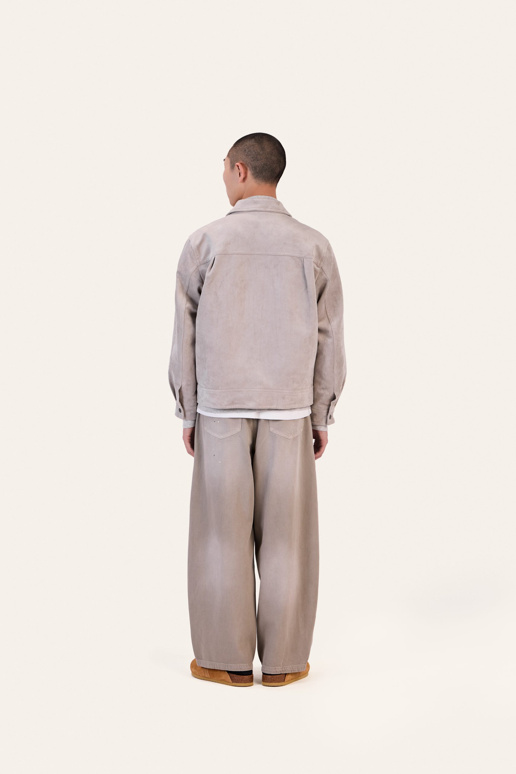 cut in the same structured silhouette, this version comes in a washed gray suede that feels almost matte to the touch dry, powdery, and quiet. The tone sits between stone and ash, giving the jacket a colder presence, less nostalgic than the brown and more restrained. With clean workwear lines and minimal detailing, it holds its shape without stiffness and settles over time, softening where it bends and folding into its wearer.