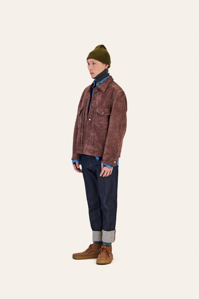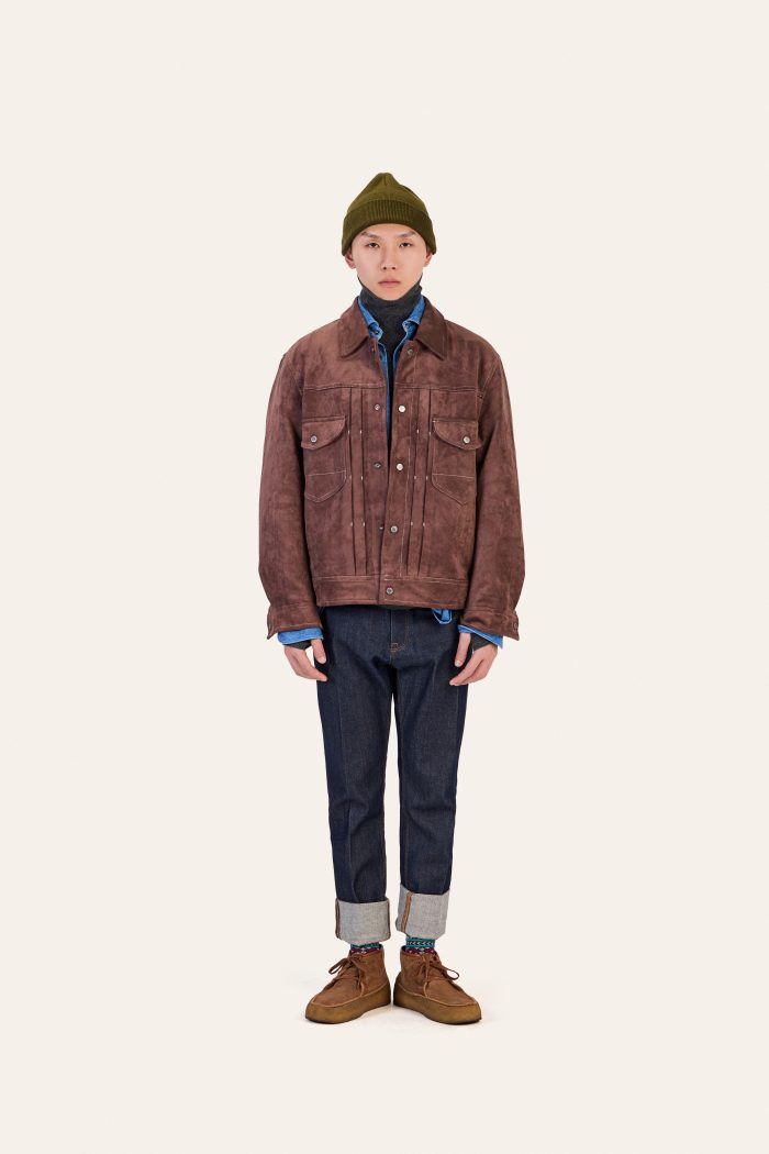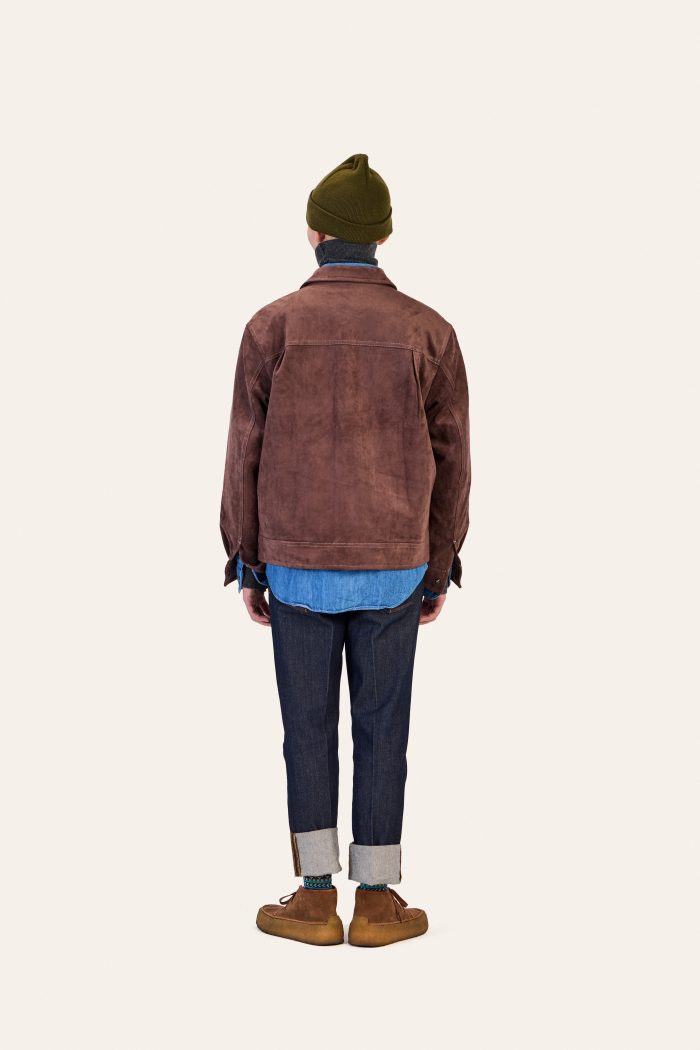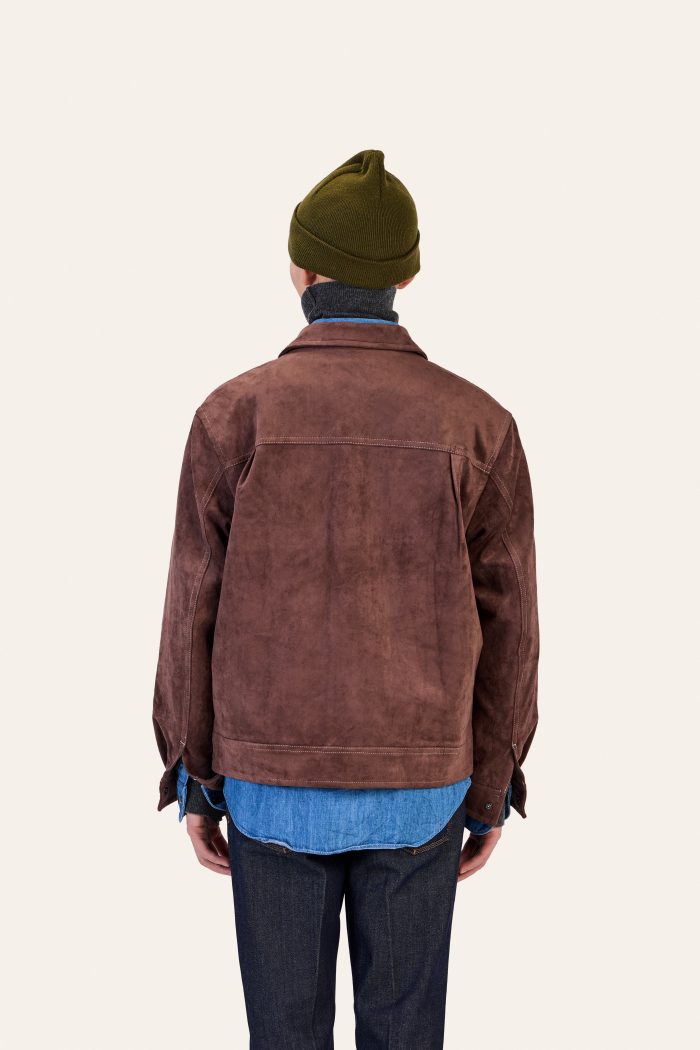 A structured suede jacket in deep brown, designed with a quiet presence. Cut from dense leather with a dry, matte surface that softens and molds with time. The silhouette is boxy with subtle workwear proportions clean pockets, minimal seaming, no unnecessary detailing. Made to age naturally and carry the marks of its wearer.