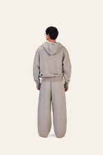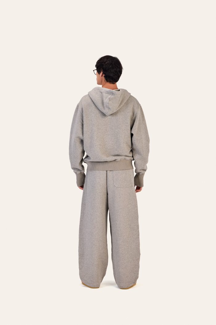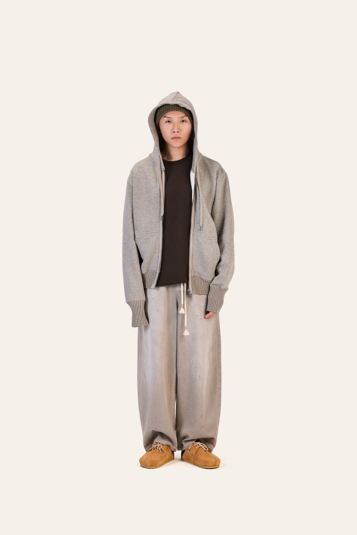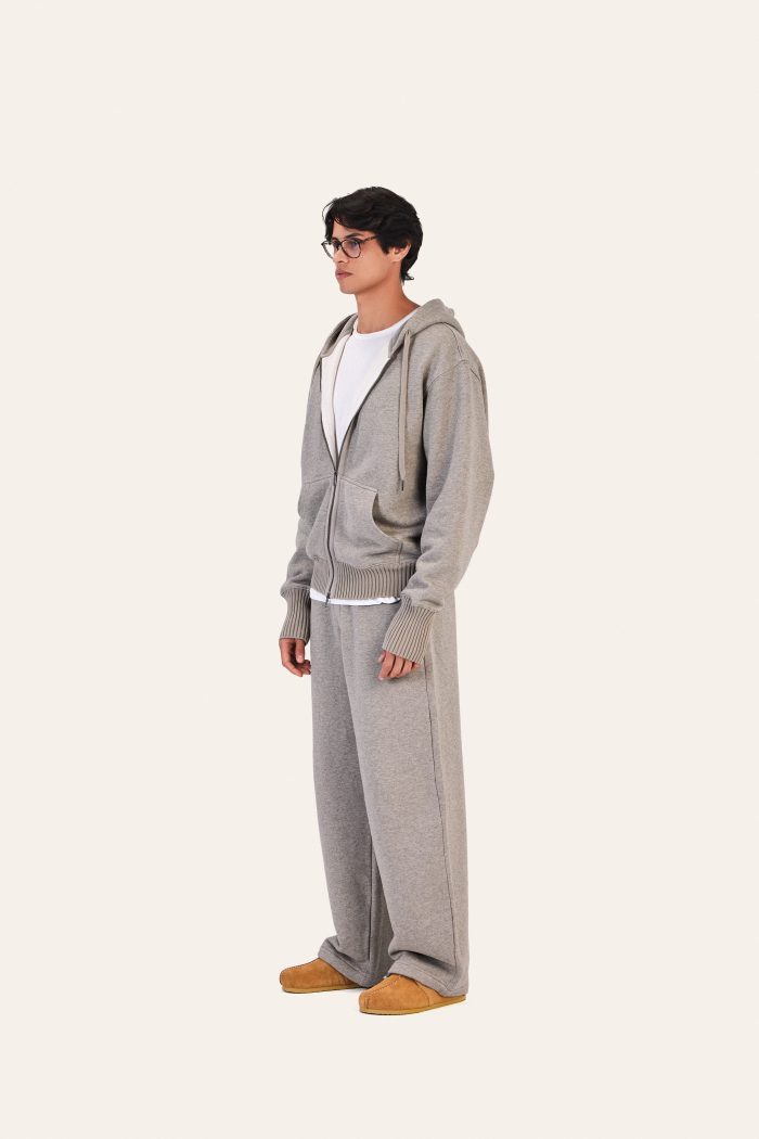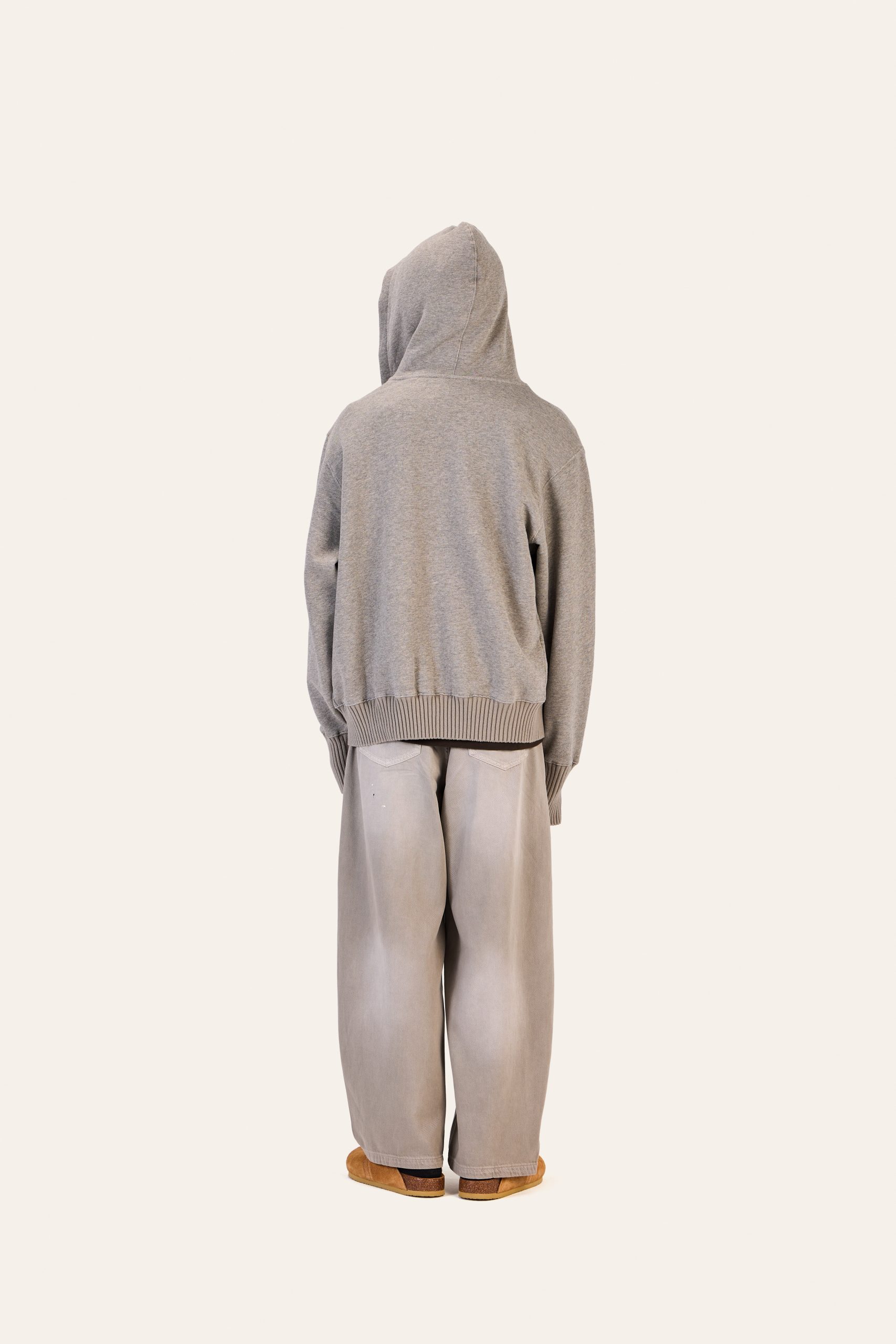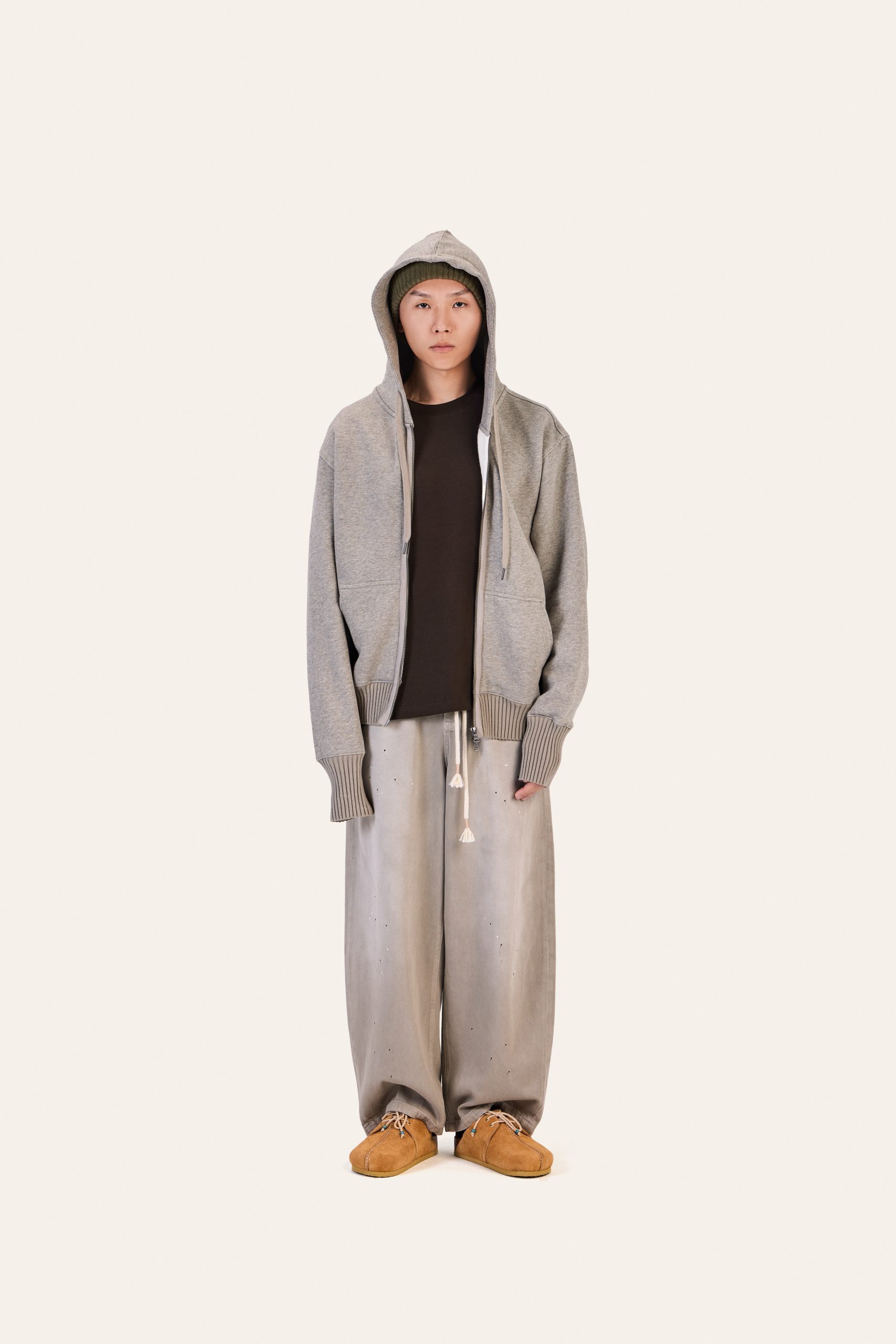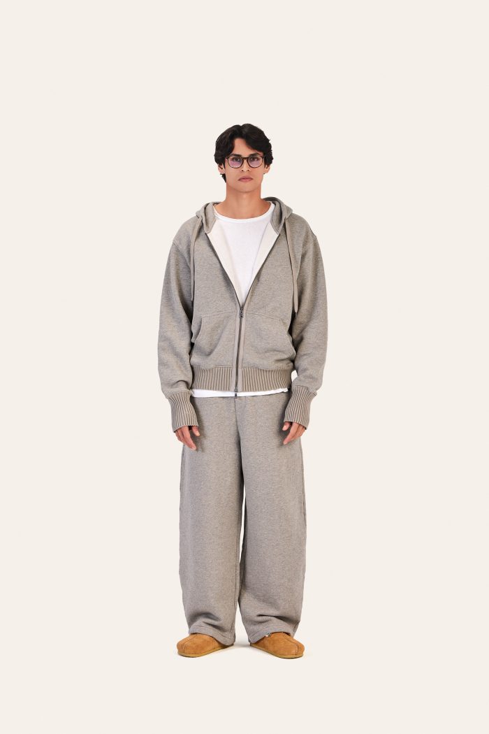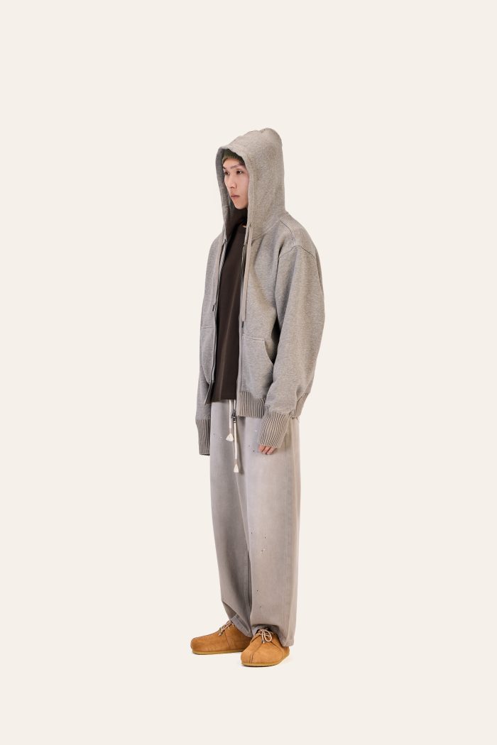 A relaxed zip hoodie cut in a heavyweight with a dry, structured hand. Designed with elongated rib cuffs that extend past the wrist, creating a refined line along the sleeve and giving the piece its distinct proportion. The silhouette falls straight from the shoulder with a gentle ease, finished with a double-layer hood and discreet front pockets. Minimal stitching, no visible branding a piece built around quiet volume and deliberate restraint.