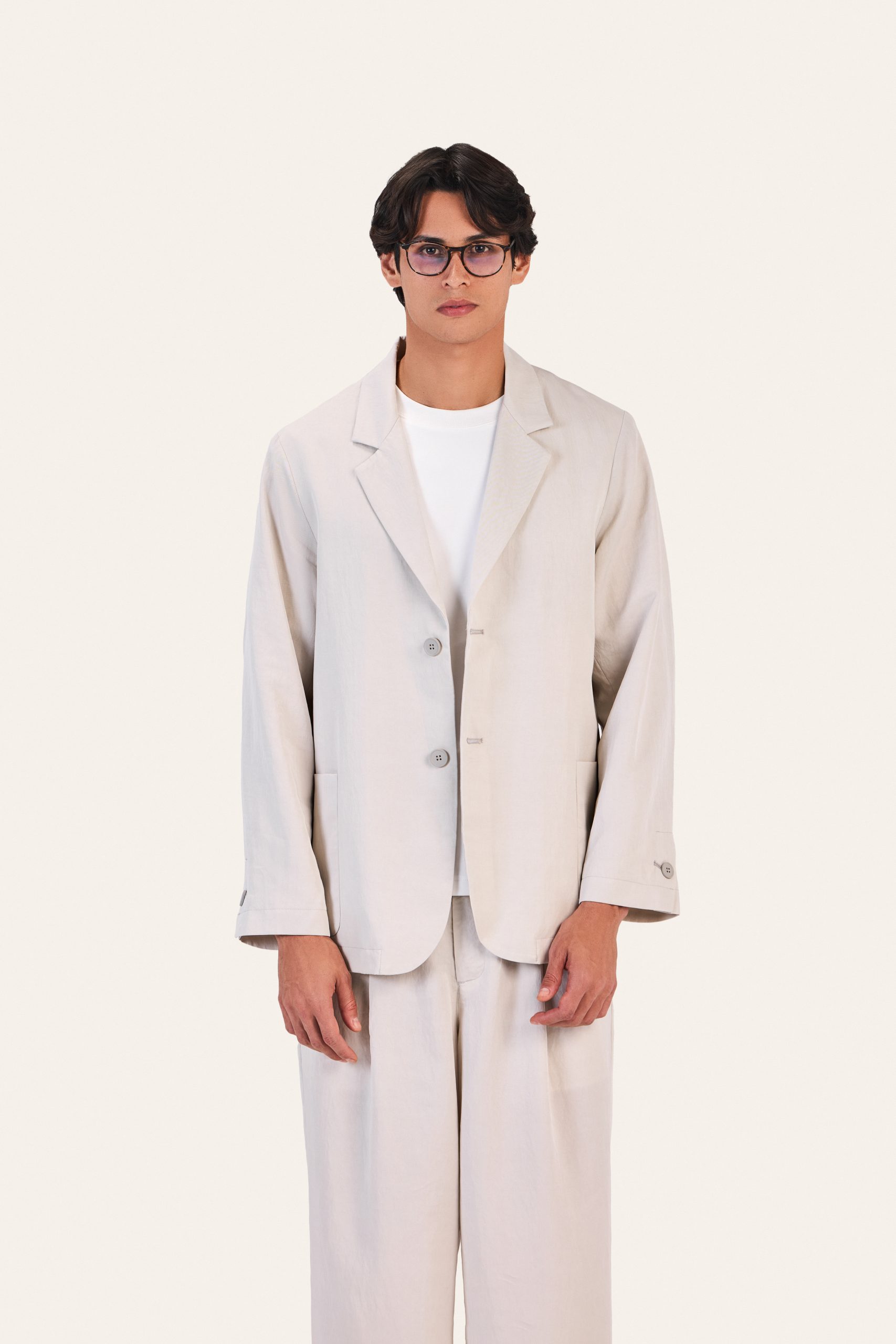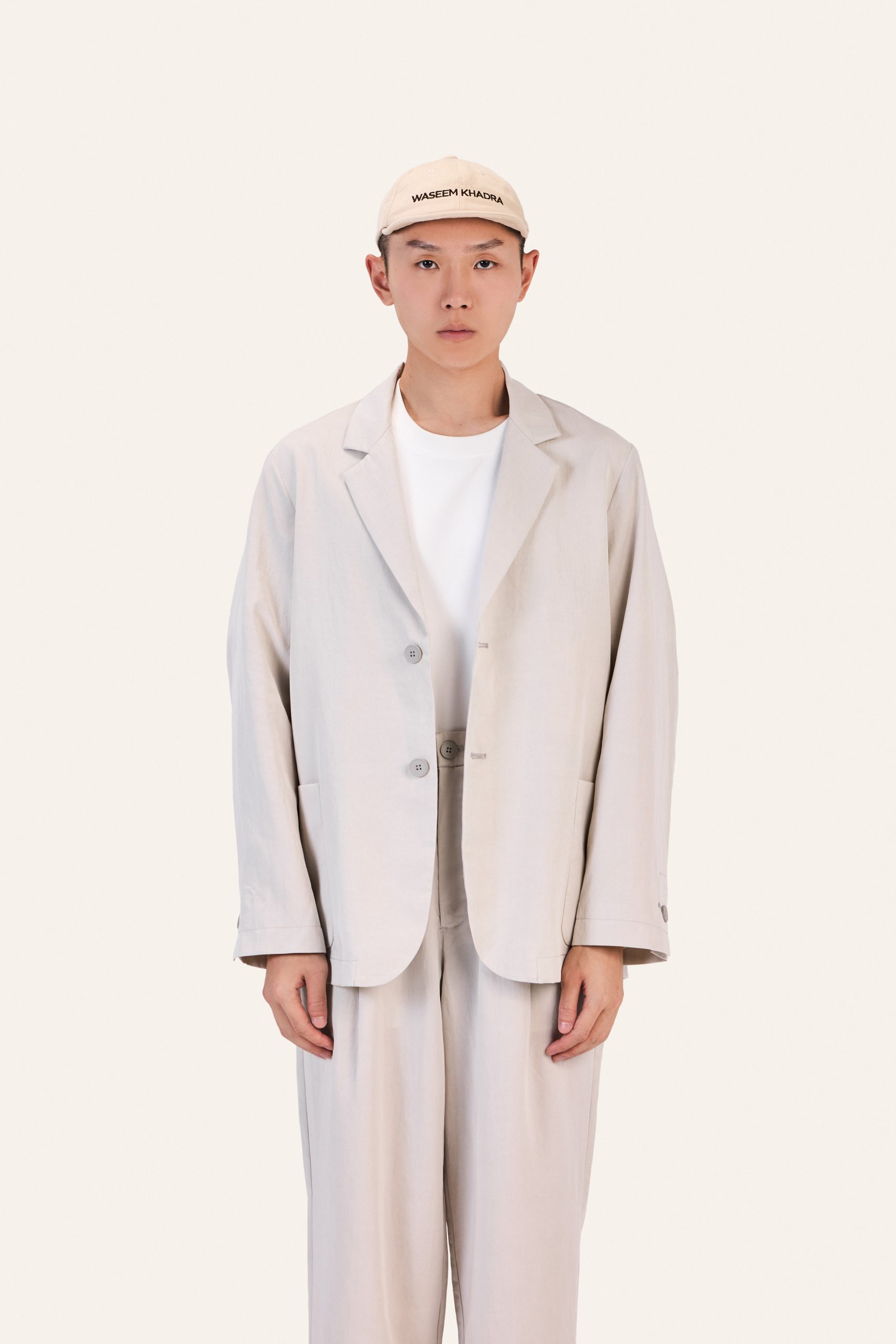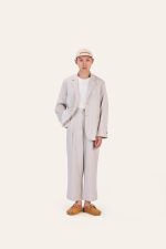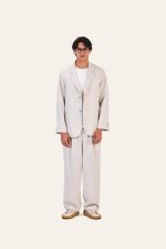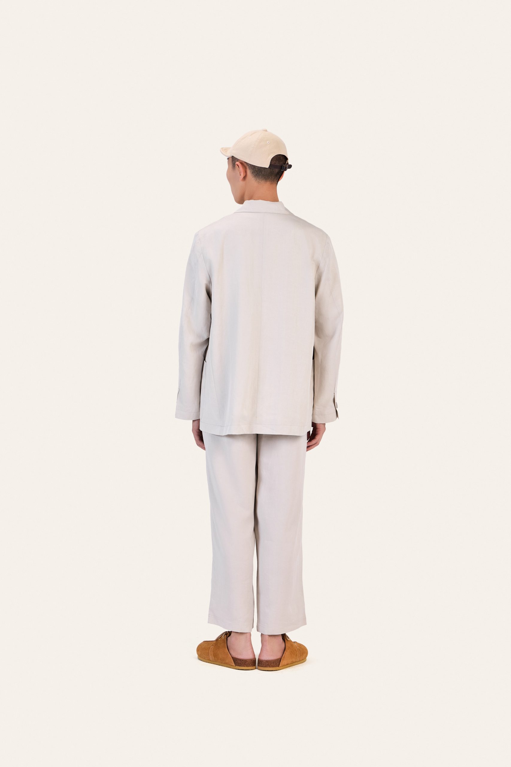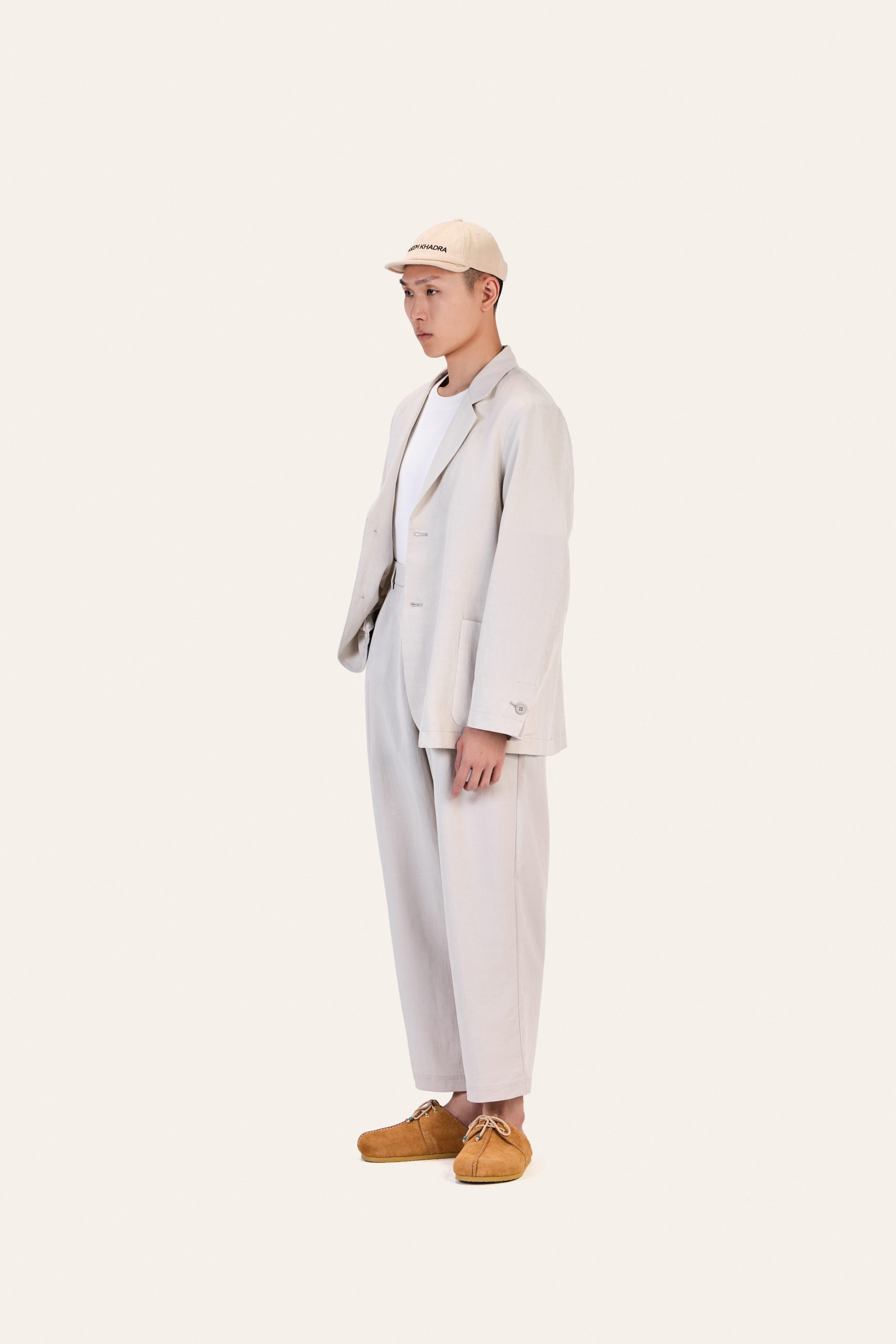 A relaxed two-piece suit cut in a lightweight, fluid cloth with a dry, matte hand. The jacket falls softly over the shoulders with no structure, allowing the fabric to move naturally with the body. The trousers sit gently at the waist with a straight, cropped line that breaks subtly over the shoe.