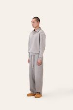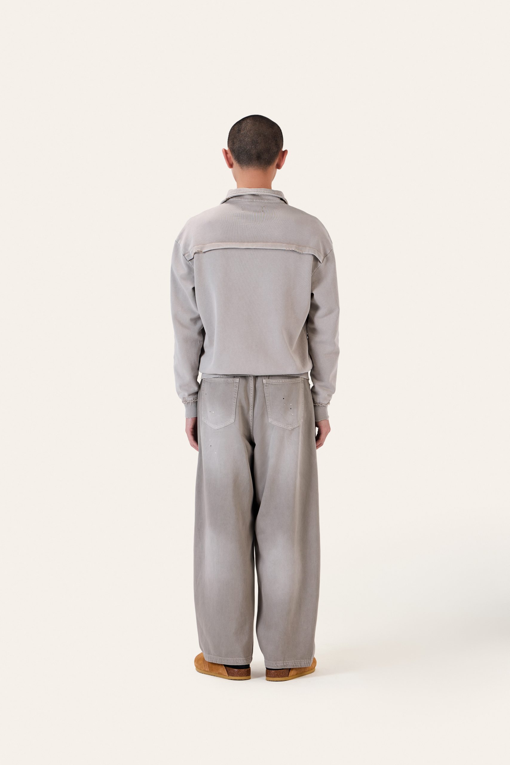 A relaxed-fit sweatshirt in a muted ash grey, designed with a deliberate worn-in finish for a sense of ease and familiarity. The silhouette falls naturally on the body, with dropped shoulders and a gathered rib hem that creates a subtle structure without losing softness. A raw, almost undone edge detail traces the waistband and cuffs, giving it a quiet irregularity that feels humanunpolished in a considered way