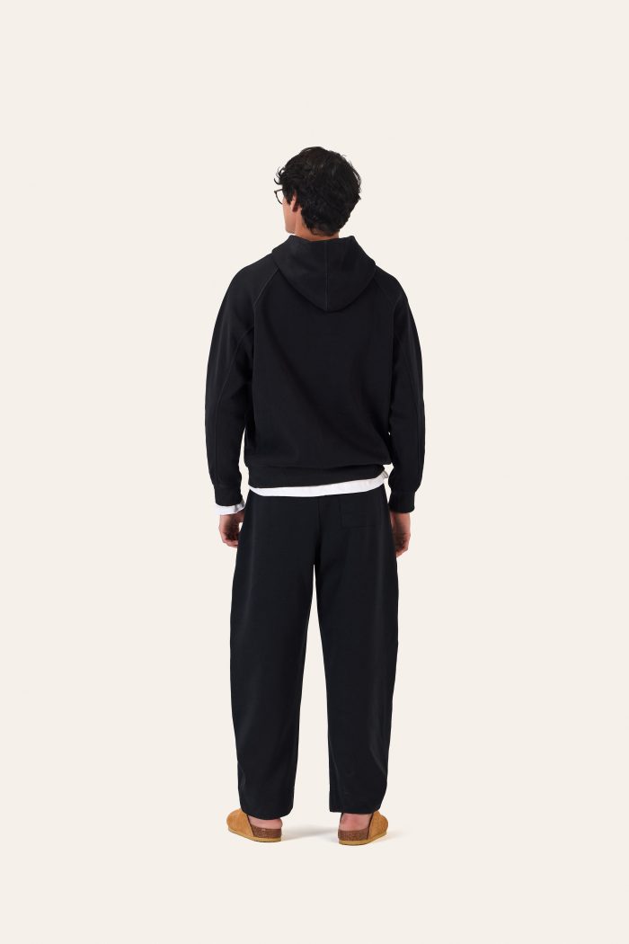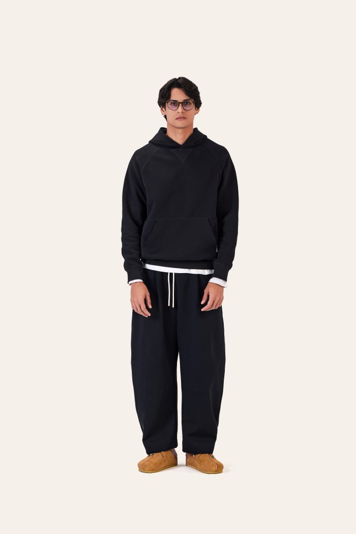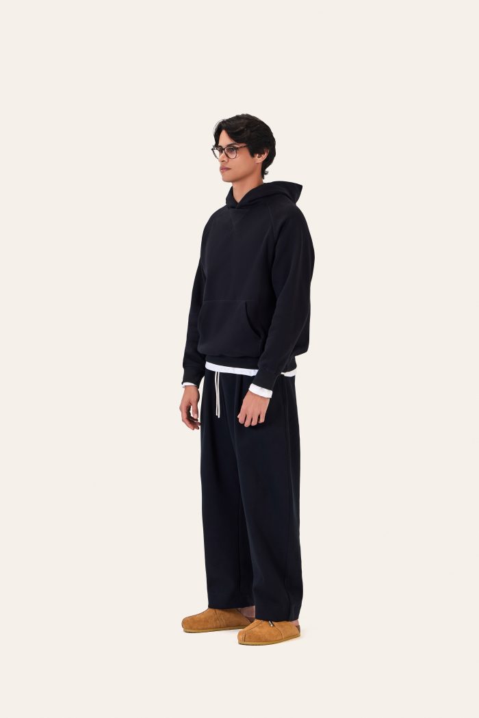 A study in quiet luxury this black hoodie is cut in a relaxed silhouette with a clean, streamlined front and a subtle kangaroo pocket that blends effortlessly into the body. Crafted from a structured yet soft fabric, it holds shape while draping naturally over the frame, embodying a refined take on casual wear.