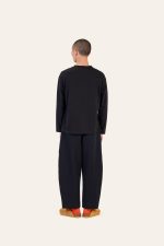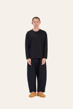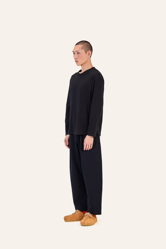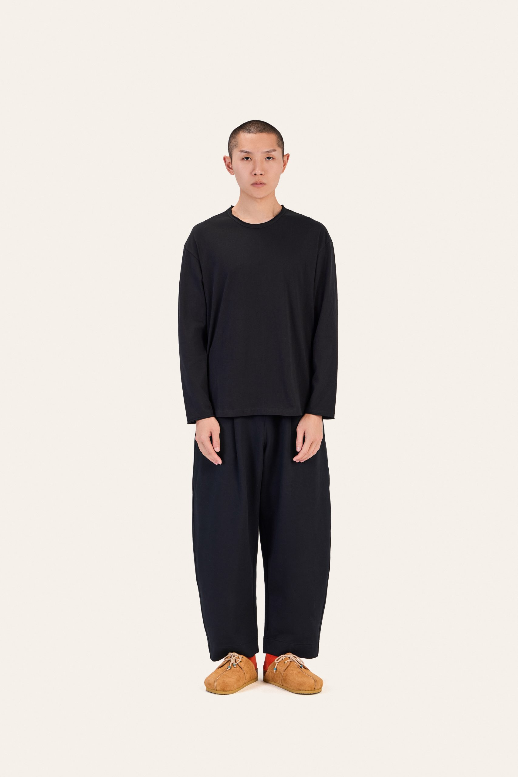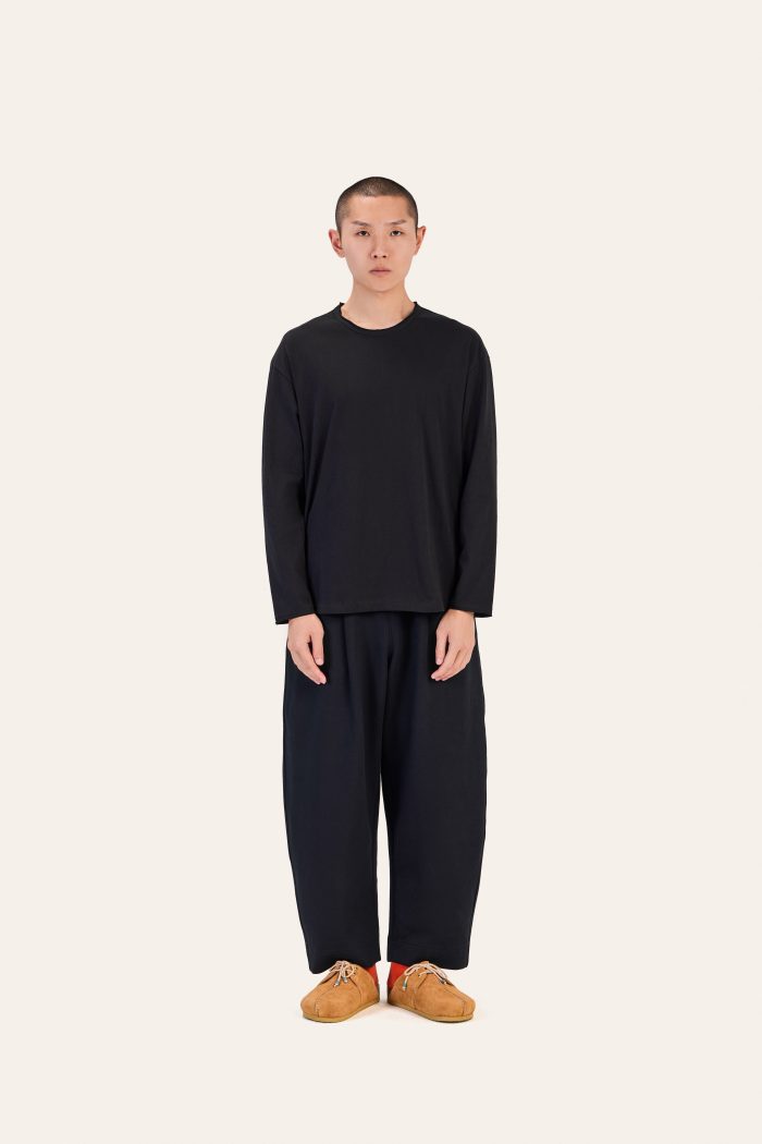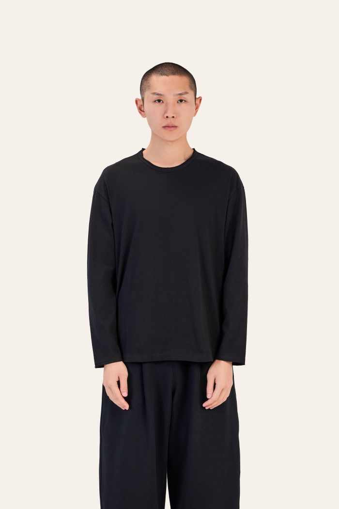An exercise in minimal precision this long-sleeve tee in deep black is cut from pure cotton with a soft, breathable texture and a fluid drape. Designed with a relaxed silhouette and a clean back seam detail, it reflects an elevated simplicity. A foundational layer that stands alone with quiet confidence or slips seamlessly into any refined wardrobe rotation.
