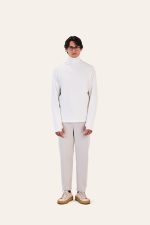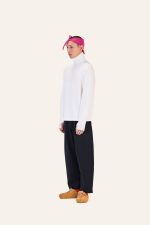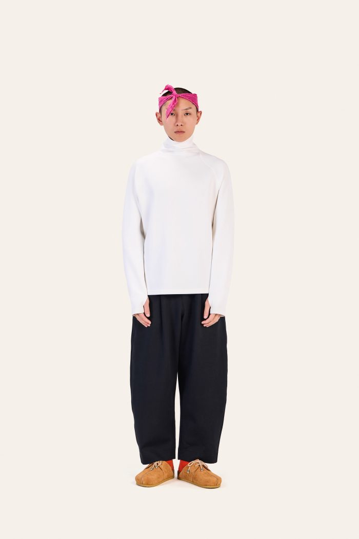 The fabric holds its architecture without clinging, allowing space between garment and skin, giving it a quiet, monastic presence.