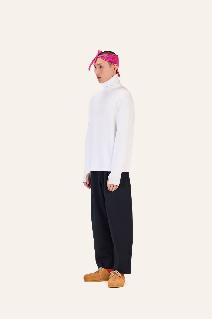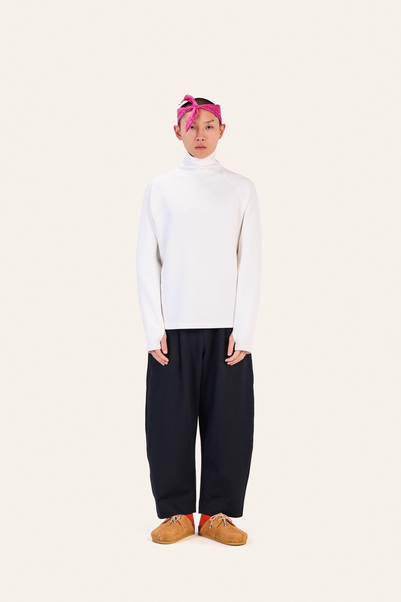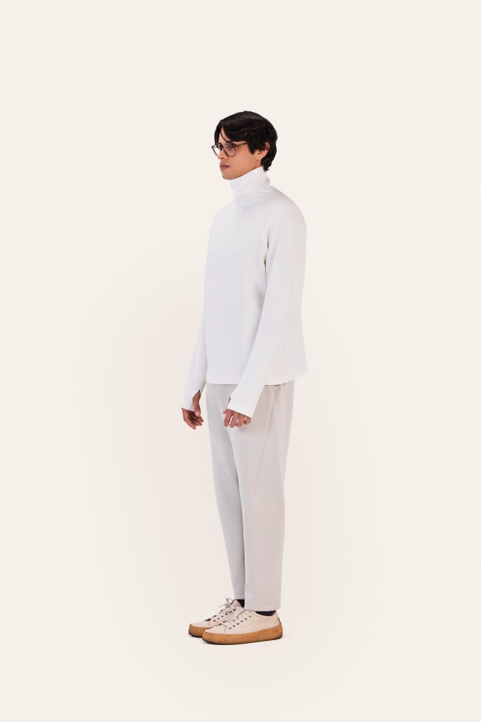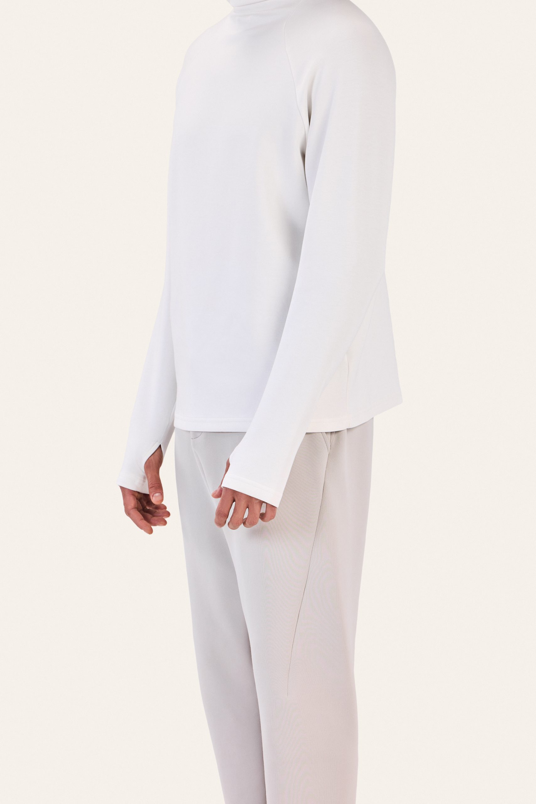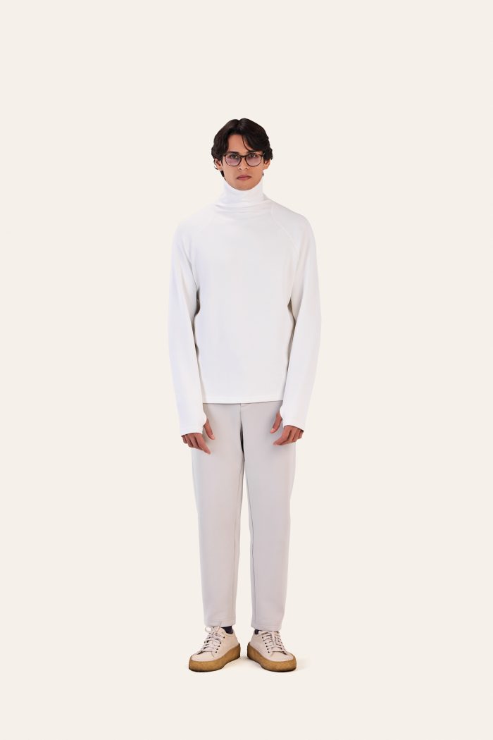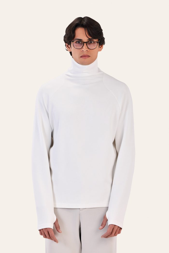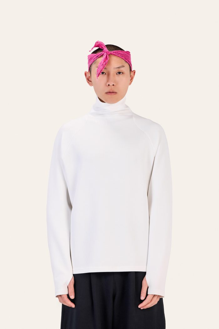 A clean high-neck top cut in technical neoprene, engineered to sit away from the body in a controlled silhouette.